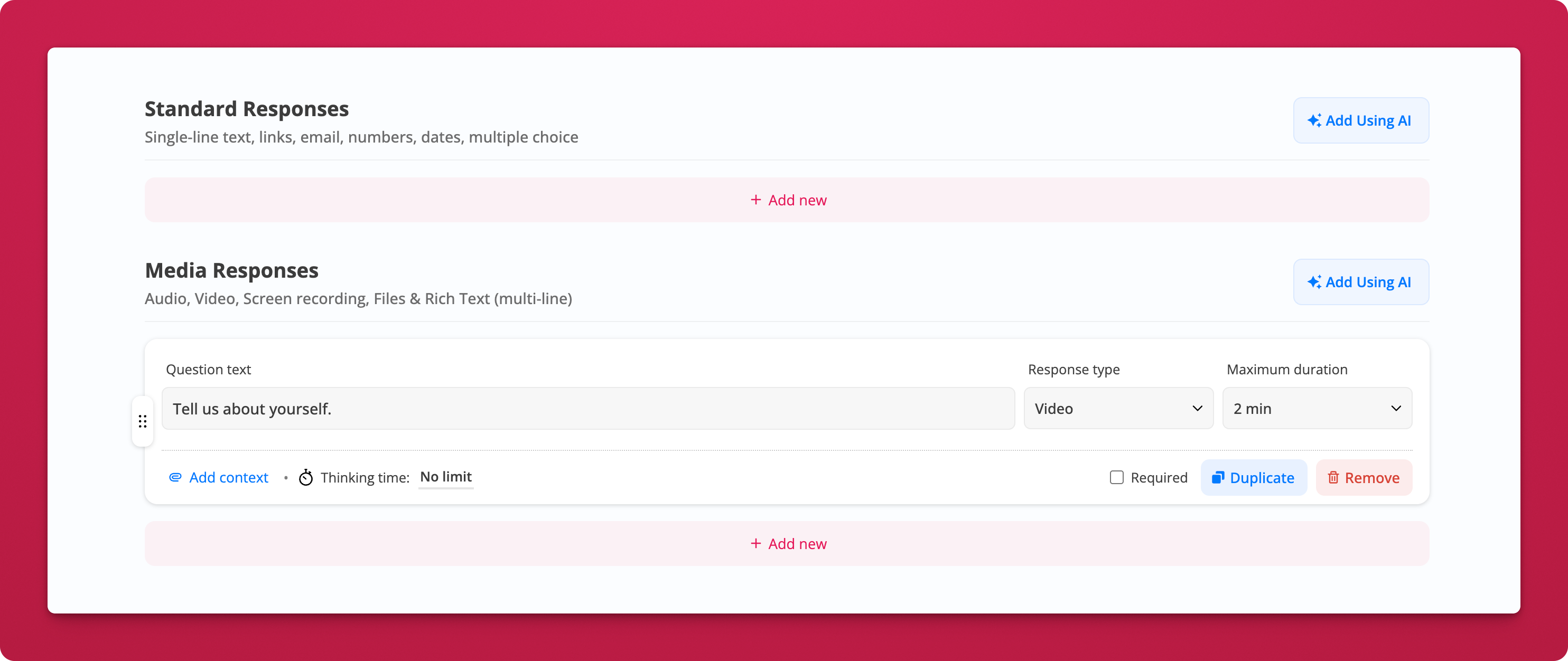 • Works for both question types. Generate Standard Response questions (text, email, links, dates, multiple choice) and Media Response questions (video, audio, screen recording, file uploads, rich text) separately, so you get the right format for each question.