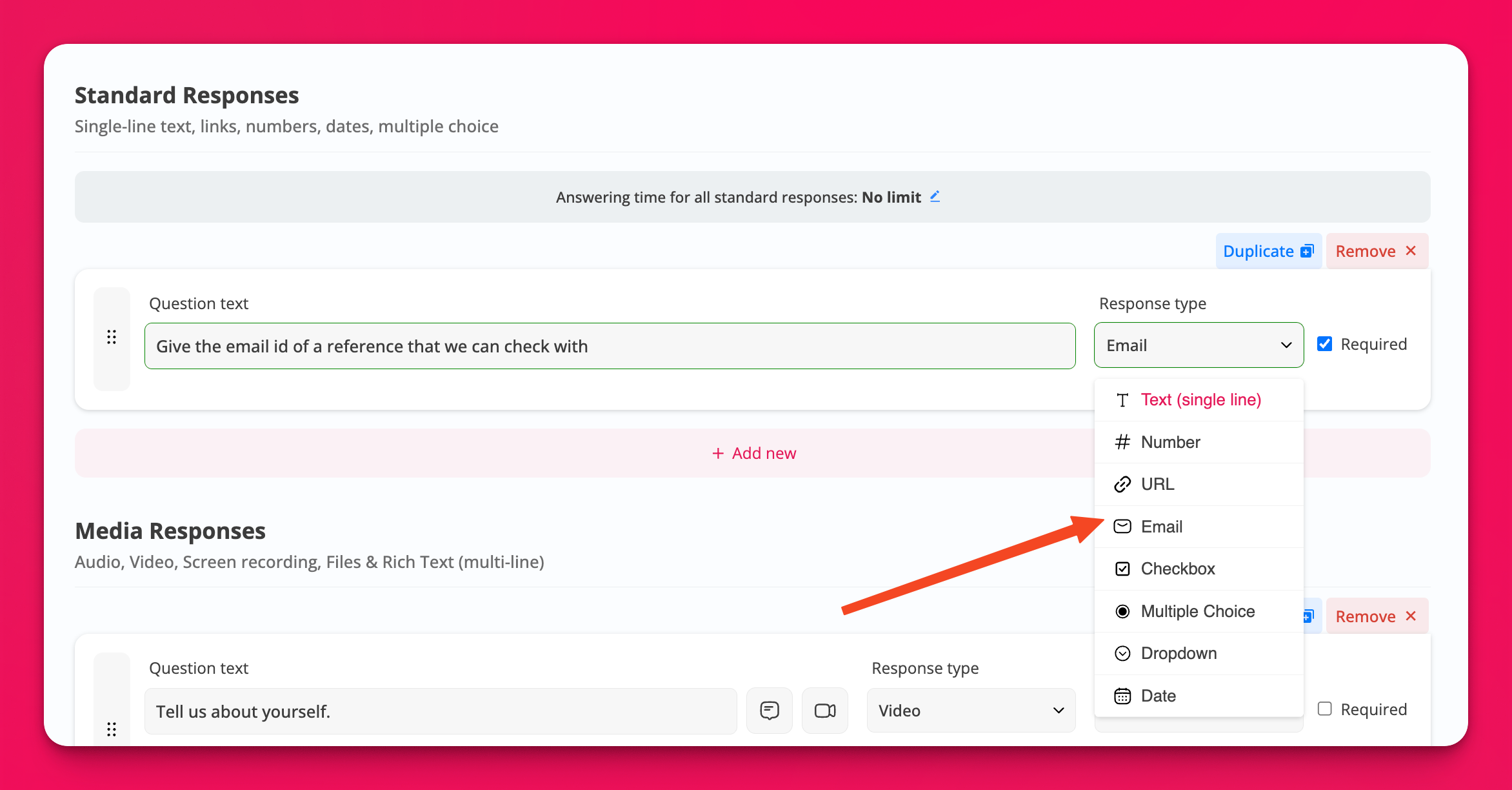 Along with single-line text, links, numbers, dates and multiple choice questions you can now collect email addresses as a standard response.