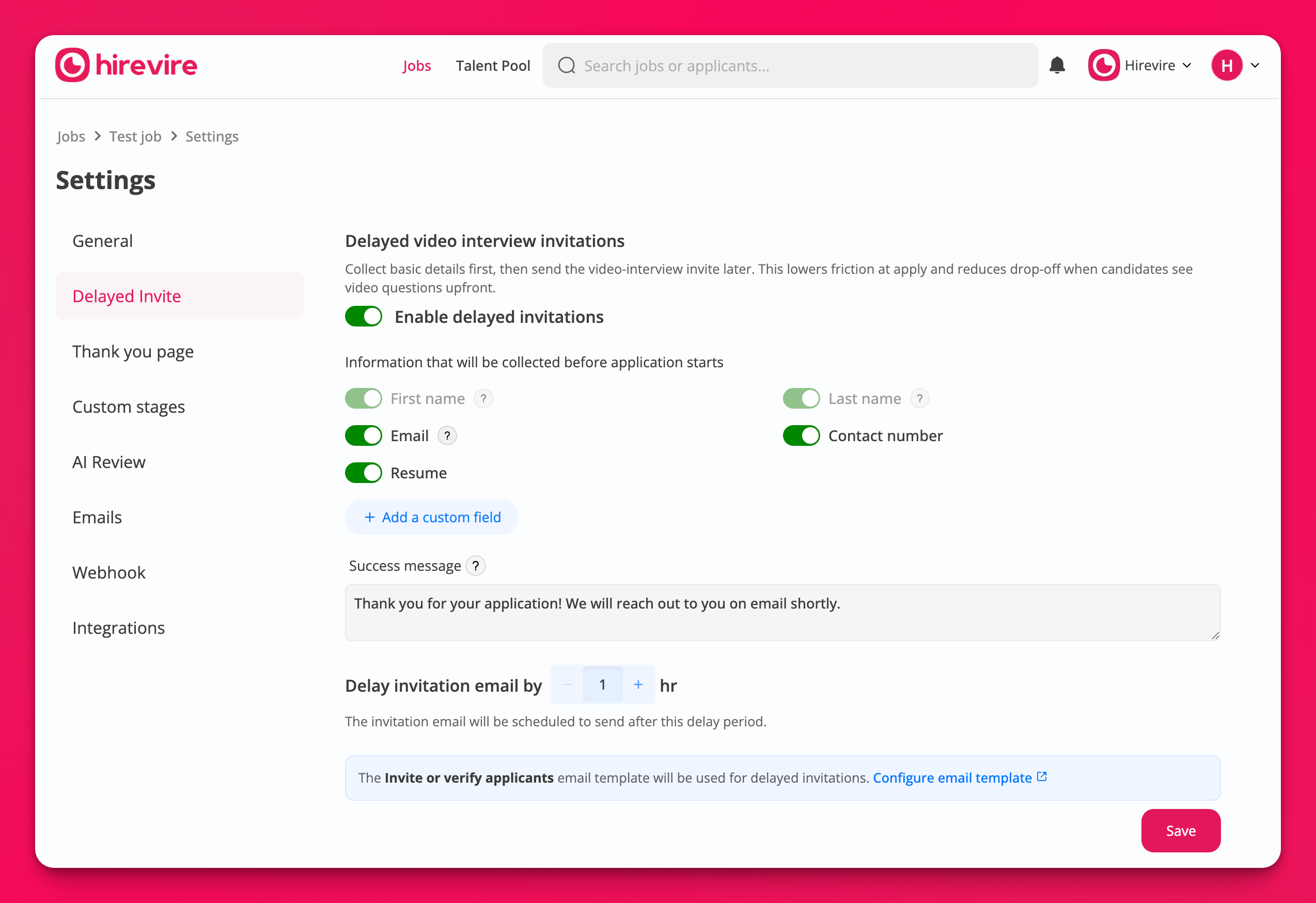Delay invites by hours: schedule the interview email to send after a configurable delay.Collect first: choose the fields to capture before the invite (email, contact number, resume, first/last name, plus custom fields).Custom confirmation: set the message candidates see immediately after applying.Template control: uses your “Invite or verify applicants” email template (link to edit from the settings panel).