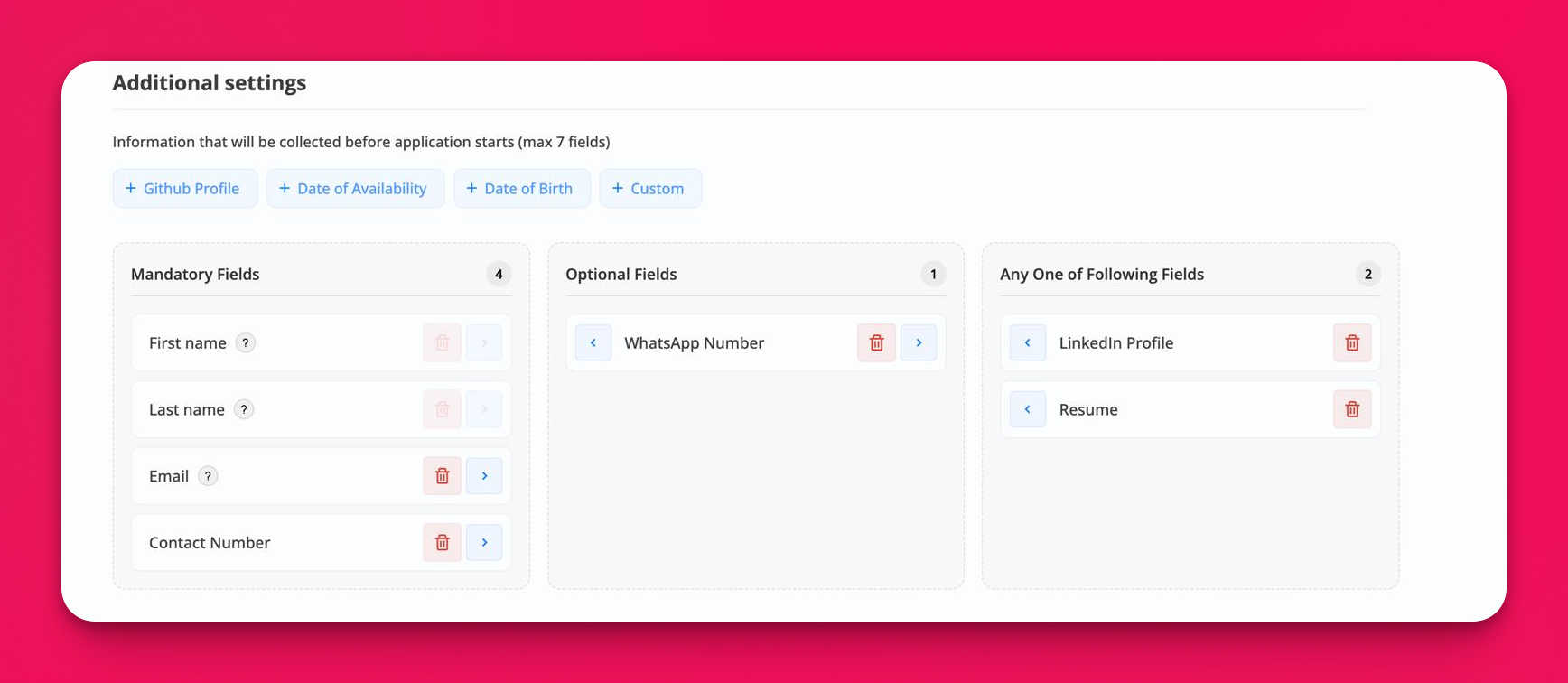 Common pattern: Mandatory = First/Last name, Email; Optional = Contact/WhatsApp; Any‑one = LinkedIn OR Resume.